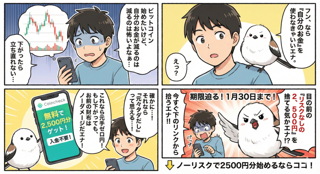 - 完全無料・ノーリスクで2,500円分のビットコインがもらえる。